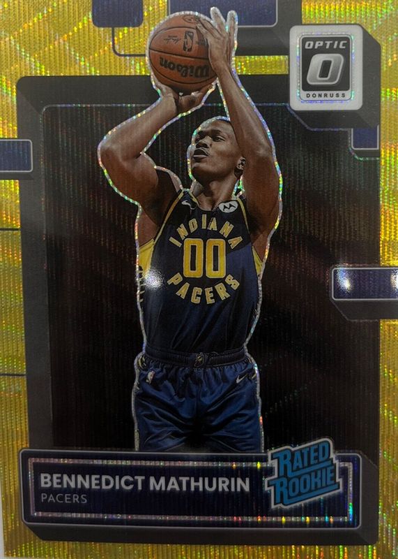 The Bennedict Mathurin 2022 Optic #209 Gold Wave /10 Rookie card in Raw condition has not changed in price in the last 30 days and was last sold for $70.00 .