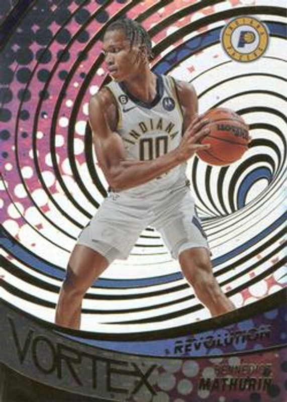 The Bennedict Mathurin 2022 Revolution #16 Vortex Rookie card is 1 of 44 Bennedict Mathurin's card variations in the 2022 Revolution set being tracked by Sports Card Investor, including Base, Asia Red, Astro, Chinese New Year, and Fractal.