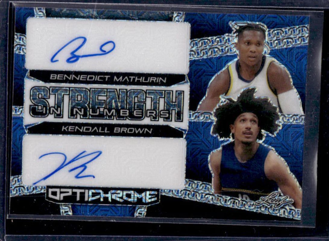 The Bennedict Mathurin / Kendall Brown 2022 Leaf Optichrome #S2-3 Strength in #'s Dual Autographs - Mojo Blue /7 card is 1 of 50 Bennedict Mathurin / Kendall Brown's card variations in the 2022 Leaf Optichrome set being tracked by Sports Card Investor, including Strength in #'s Dual Autographs - Prismatic Blue /10, Strength in #'s Dual Autographs - Crystal Blue /8, Strength in #'s Dual Autographs - Prismatic Pink /8, Strength in #'s Dual Autographs - Prismatic Purple /8, and Strength in #'s Dual Autographs - Crystal Purple /7.