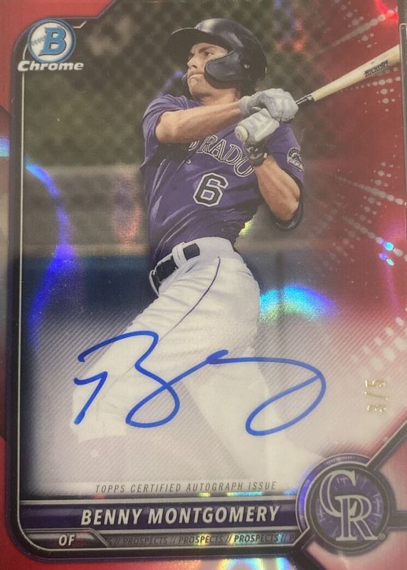 Auctions Ending Soon for Benny Montgomery 2022 Bowman #CPA-BMY Chrome Prospect Auto - Red Lava Refractor /5 RAW