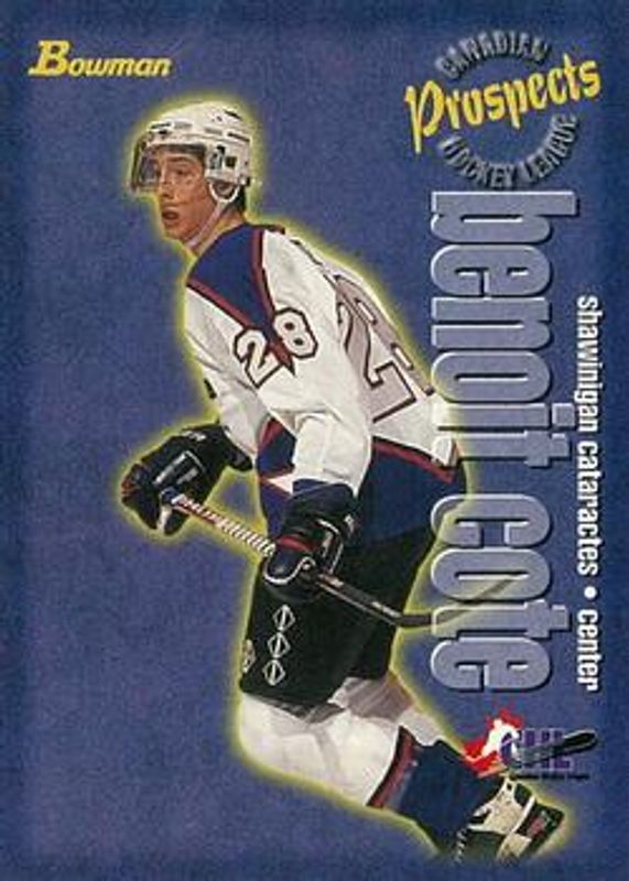 The Benoit Cote 1997 Bowman CHL #128 Base card is 1 of 3 Benoit Cote's card variations in the 1997 Bowman CHL set being tracked by Sports Card Investor, including O-Pee-Chee, and Autographs.