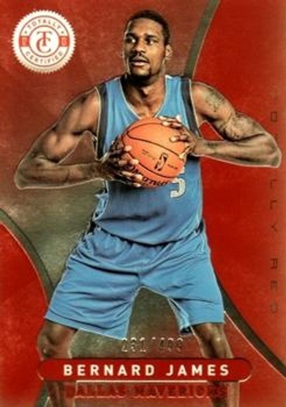 The Bernard James 2012 Totally Certified #288 Totally Red /499 Rookie card is 1 of 16 Bernard James' card variations in the 2012 Totally Certified set being tracked by Sports Card Investor, including Base, Totally Blue /299, Totally Gold /25, Totally Green /5, and Printing Plate Black /1.