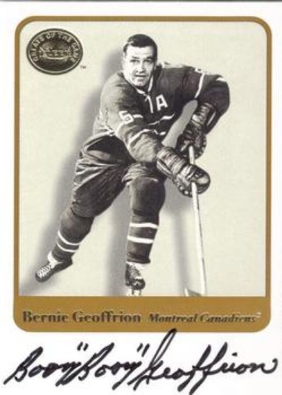 The Bernie "Boom Boom" Geoffrion 2001 Fleer Greats of the Game Autographs card is 1 of 2 Bernie "Boom Boom" Geoffrion's card variations in the 2001 Fleer Greats of the Game set being tracked by Sports Card Investor, including Base.