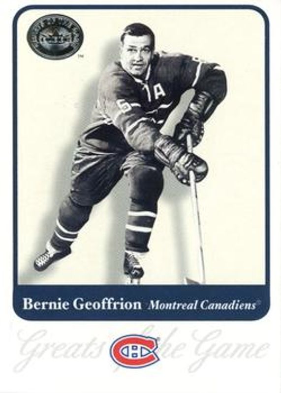 The Bernie "Boom Boom" Geoffrion 2001 Fleer Greats of the Game #37 Base card is 1 of 2 Bernie "Boom Boom" Geoffrion's card variations in the 2001 Fleer Greats of the Game set being tracked by Sports Card Investor, including Autographs.