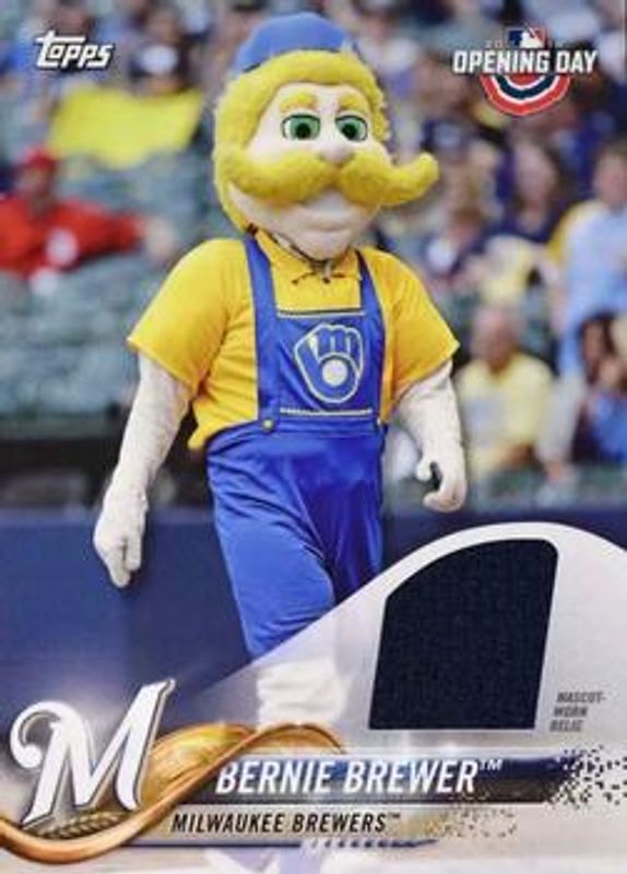The Bernie Brewer 2018 Topps Opening Day #MR-BB Mascots Relics card is 1 of 6 Bernie Brewer's card variations in the 2018 Topps Opening Day set being tracked by Sports Card Investor, including Mascots, Mascots Autographs, Mascots Relics Autographs, Mascots - 5x7 /49, and Mascots - 5x7 Gold /10.