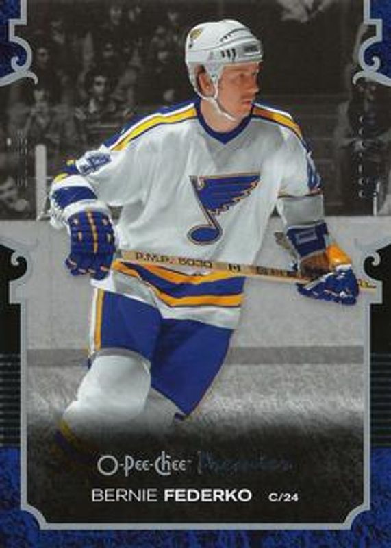 The Bernie Federko 2007 O-Pee-Chee Premier #24 Base /299 card is 1 of 8 Bernie Federko's card variations in the 2007 O-Pee-Chee Premier set being tracked by Sports Card Investor, including Gold /50, Silver Spectrum /35, Gold Spectrum /15, Black /1, and Penmanship /100.