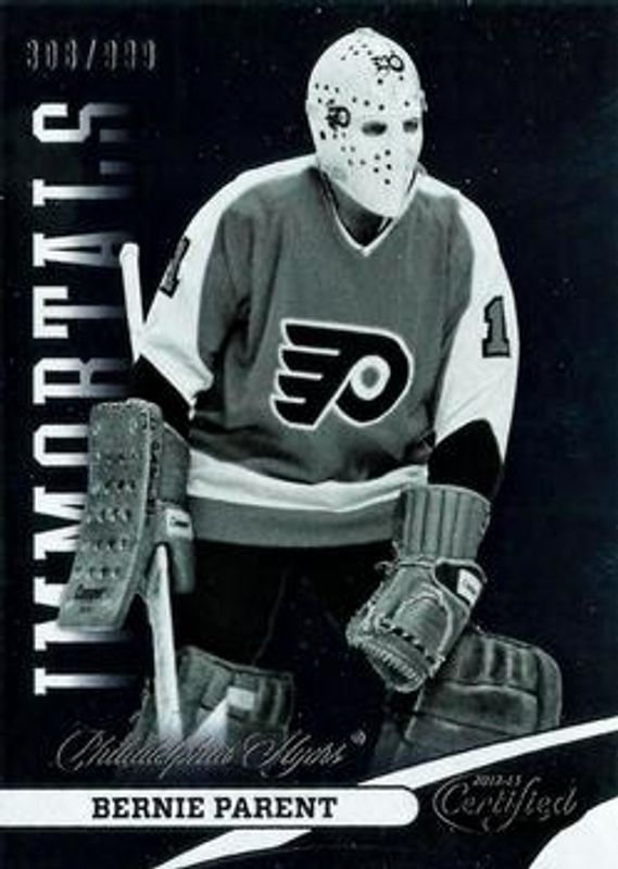The Bernie Parent 2012 Certified #135 Base /999 card is 1 of 9 Bernie Parent's card variations in the 2012 Certified set being tracked by Sports Card Investor, including Mirror Red /100, Mirror Hot Box /75, Mirror Blue /50, Mirror Gold /25, and Mirror Emerald /5.