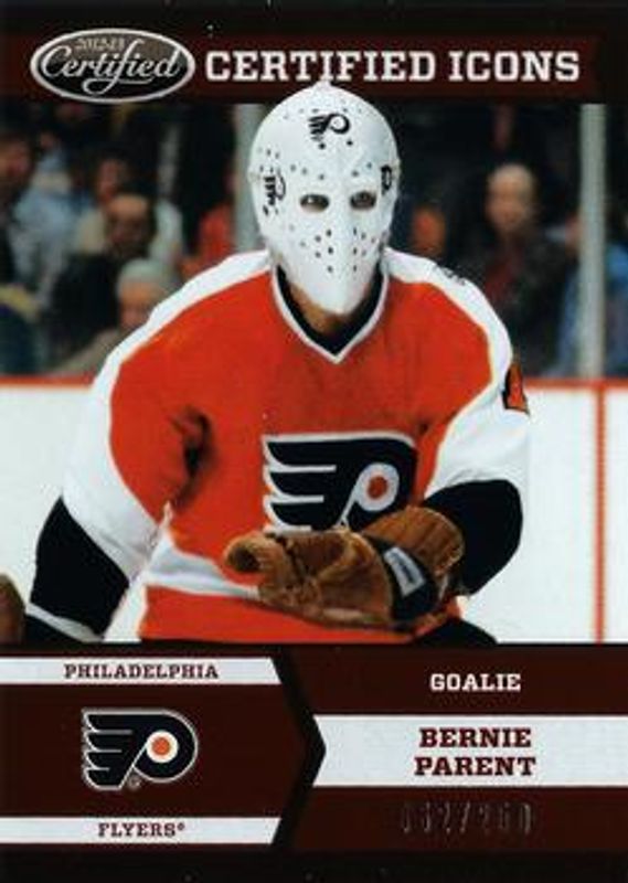 The Bernie Parent 2012 Certified #I-12 Icons /250 card is 1 of 9 Bernie Parent's card variations in the 2012 Certified set being tracked by Sports Card Investor, including Base /999, Mirror Red /100, Mirror Hot Box /75, Mirror Blue /50, and Mirror Gold /25.