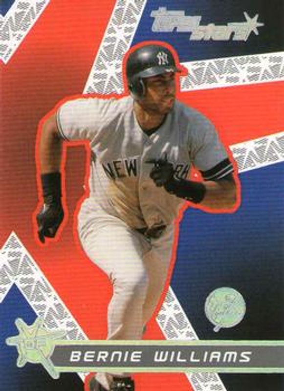 The Bernie Williams 2001 Topps Stars #99 Base card is 1 of 4 Bernie Williams' card variations in the 2001 Topps Stars set being tracked by Sports Card Investor, including Gold /499, Onyx /99, and Elimination.