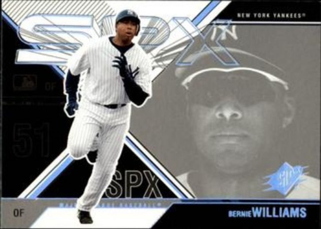 The Bernie Williams 2003 SPx #81 Base /999 card is 1 of 10 Bernie Williams' card variations in the 2003 SPx set being tracked by Sports Card Investor, including #81 Spectrum /25, #WM-BW1b Winning Materials /375, #WM-BW1a Winning Materials /375, #WM-BW1b Winning Materials /250, and #WM-BW1a Winning Materials /250.