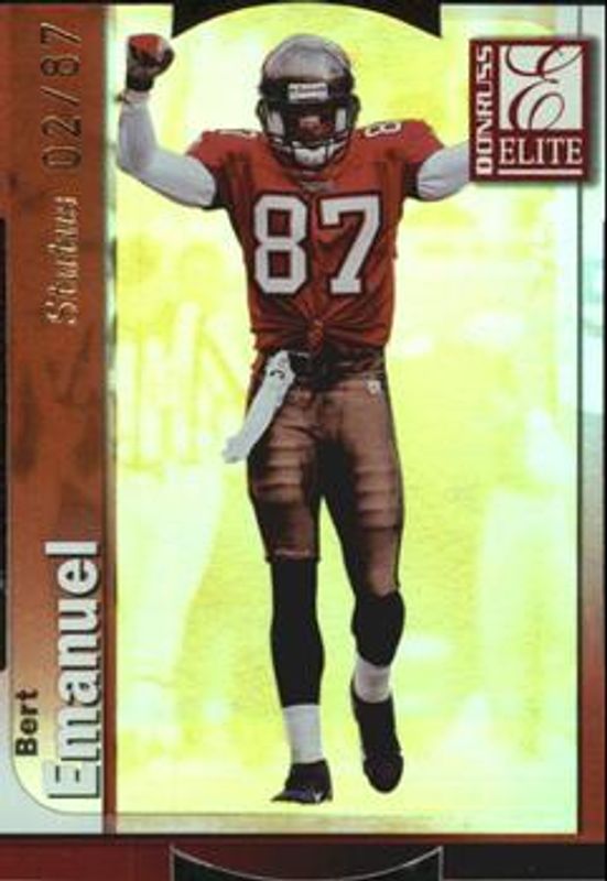 The Bert Emanuel 1999 Donruss Elite #063 Status /28 card is 1 of 3 Bert Emanuel's card variations in the 1999 Donruss Elite set being tracked by Sports Card Investor, including Base, and Aspirations /72.