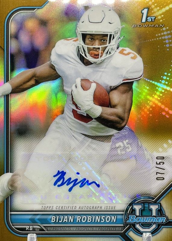 Best Prices Available For Sale of Bijan Robinson 2021 Bowman University #BCPA-BR Chrome Prospect Auto - Gold Refractor /50 (1st)