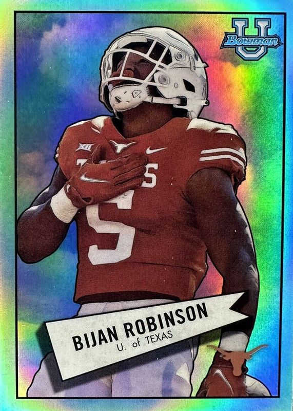 This card is 1 of 52 Bijan Robinson's card variations in the 2022 Bowman Chrome University set being tracked by Sports Card Investor, including Prospects, Prospects - Pink Refractor, Prospects - Purple Shimmer Refractor, Prospects - Refractor, and Prospects - Purple Mini-Diamond Refractor /399.