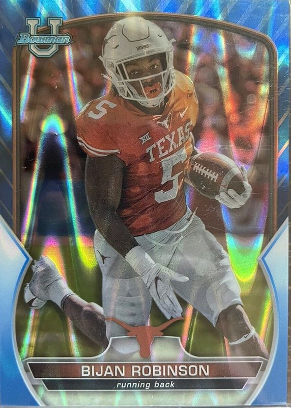The Bijan Robinson 2022 Bowman Chrome University #70 Prospects - Blue RayWave Refractor /199 card in Raw condition has not changed in price in the last 30 days and was last sold for $9.00 .