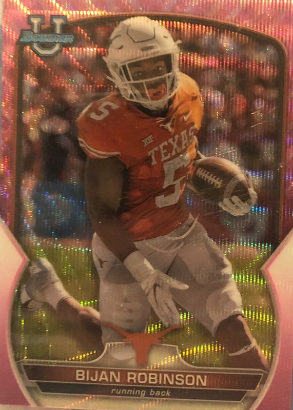 The Bijan Robinson 2022 Bowman Chrome University #70 Prospects - Pink Wave Refractor /125 card in Raw condition has not changed in price in the last 30 days and was last sold for $12.04 .