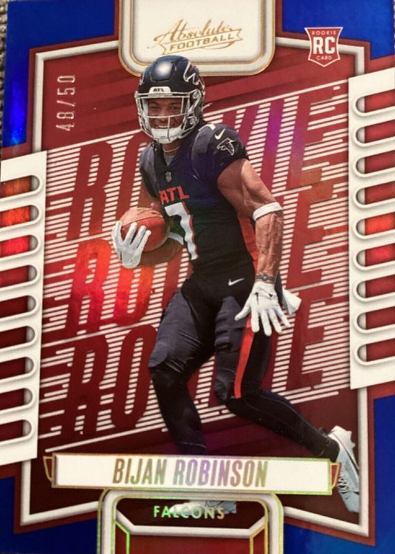 The Bijan Robinson 2023 Absolute #106 Blue Spectrum /50 Rookie card in Raw condition has not changed in price in the last 30 days and was last sold for $11.50 .