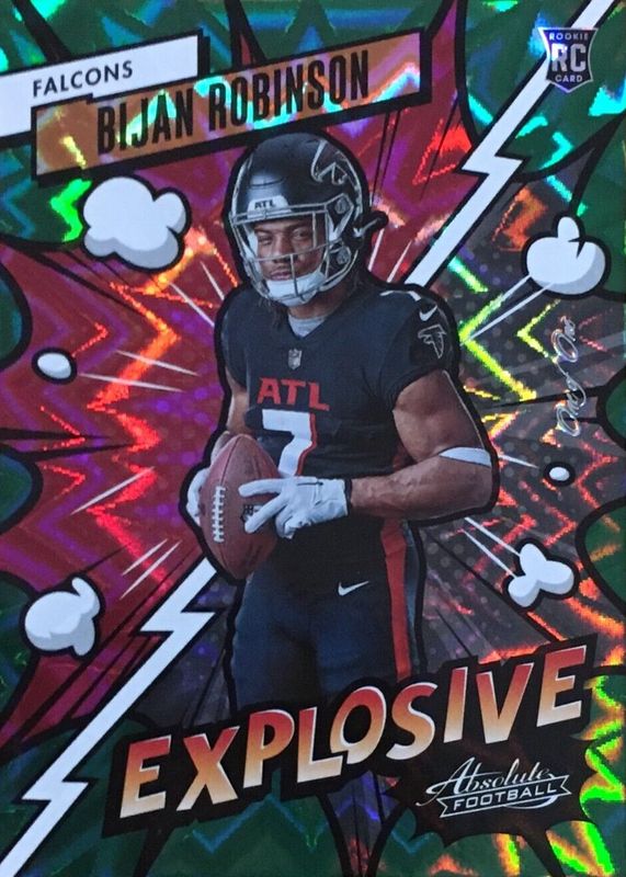 The Bijan Robinson 2023 Absolute #44 Explosive - Green /1 Rookie card in Raw condition has not changed in price in the last 30 days and was last sold for $2,950.00 .