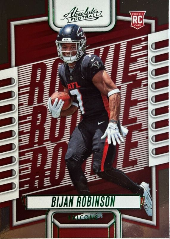 The Bijan Robinson 2023 Absolute #106 Green Rookie card in Raw condition has not changed in price in the last 30 days and was last sold for $2.50 .