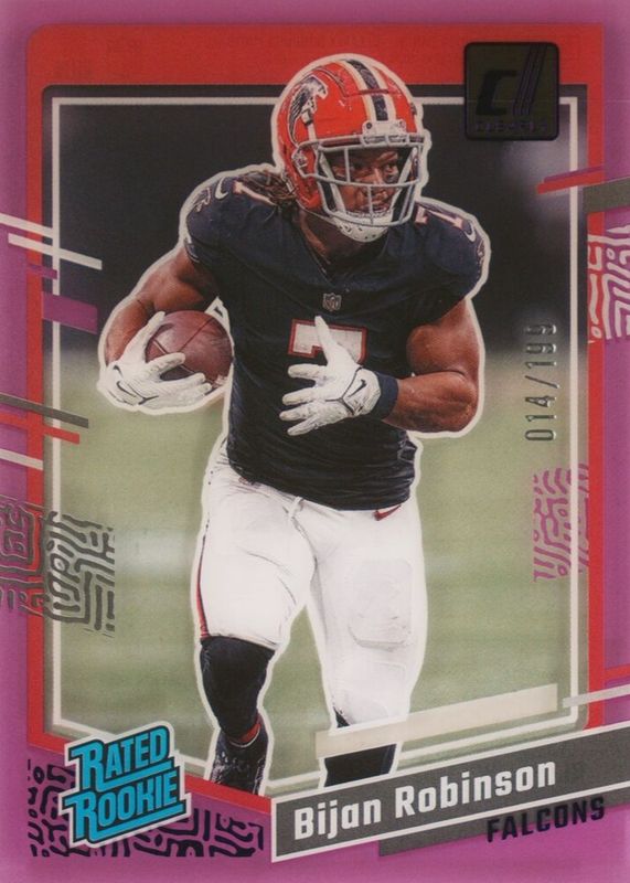 The Bijan Robinson 2023 Clearly Donruss #53 Purple /199 Rookie card in Raw condition has not changed in price in the last 30 days and was last sold for $9.99 .