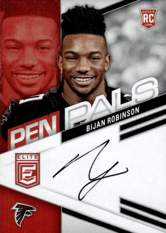 The Bijan Robinson 2023 Elite #PPBR Pen Pals - Red Ink Rookie card in Raw condition has not changed in price in the last 30 days and was last sold for $24.50 .