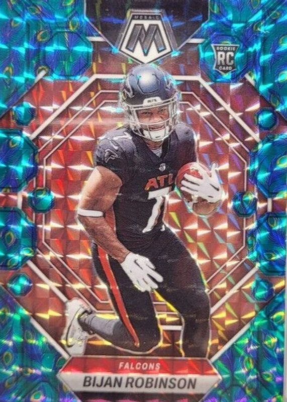 The Bijan Robinson 2023 Mosaic #284 Choice Peacock /(SSP) Rookie card in Raw condition has not changed in price in the last 30 days and was last sold for $393.00 .