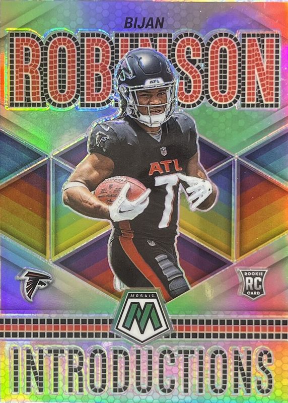 The Bijan Robinson 2023 Mosaic #I-6 Introductions - Silver Rookie card in Raw condition has not changed in price in the last 30 days and was last sold for $5.99 .