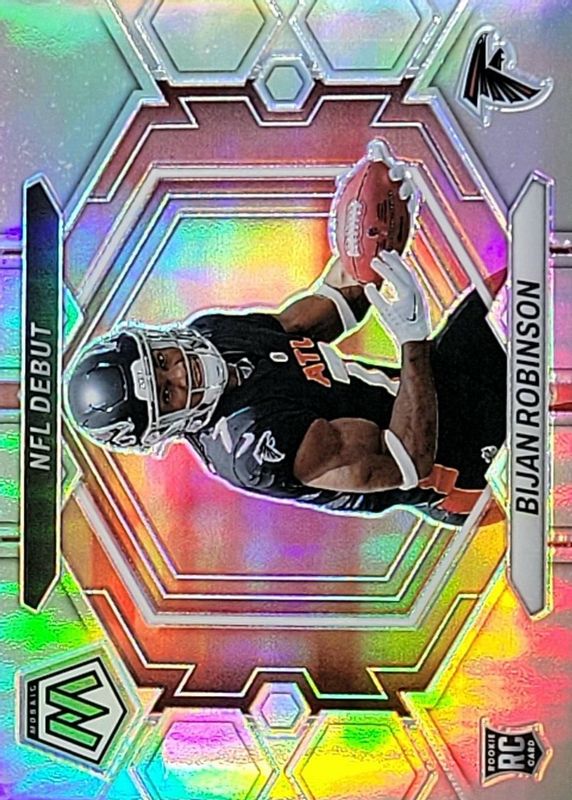 The Bijan Robinson 2023 Mosaic #ND-9 NFL Debut - Silver Rookie card in Raw condition has moved up $3.08 (+155%) in the last 30 days and was last sold for $5.07 .