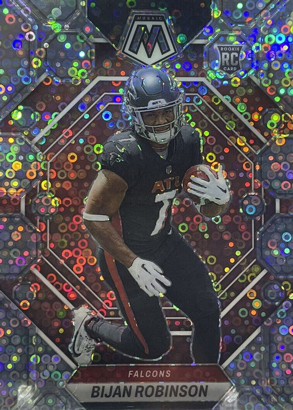 This card is 1 of 123 Bijan Robinson's card variations in the 2023 Mosaic set being tracked by Sports Card Investor, including Base, NFL Debut, Choice Red & Green, Green, and Mosaic.