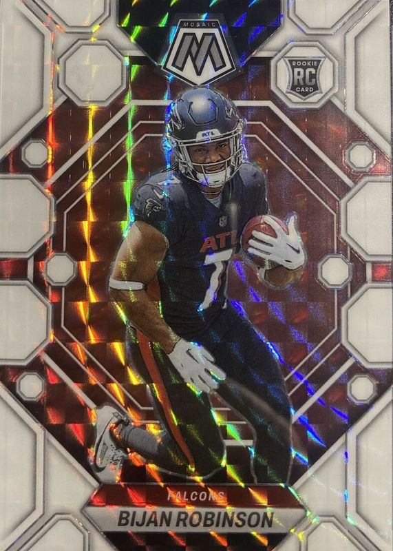 This card is 1 of 123 Bijan Robinson's card variations in the 2023 Mosaic set being tracked by Sports Card Investor, including Base, NFL Debut, Choice Red & Green, Green, and Mosaic.