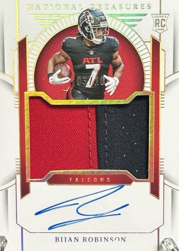 This card is 1 of 59 Bijan Robinson's card variations in the 2023 National Treasures set being tracked by Sports Card Investor, including Rookie Material Signatures - Green Jersey Number (/7), Rookie Patch Auto - Green Jersey Number (/7), Crossover Rookie Patch Autographs /99, Rookie Material Signatures /99, and Rookie Patch Auto /99.