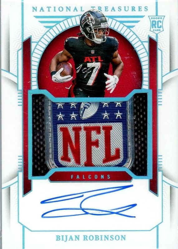 The Bijan Robinson 2023 National Treasures #158 Rookie Patch Auto - Platinum NFL Shield /1 card in Raw condition has not changed in price in the last 30 days and was last sold for $7,100.00 .