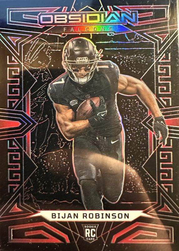 This card is 1 of 68 Bijan Robinson's card variations in the 2023 Obsidian set being tracked by Sports Card Investor, including Base, Asia, Electric Etch Red Flood /90, Electric Etch Purple /75, and Electric Etch Contra /(SSP).