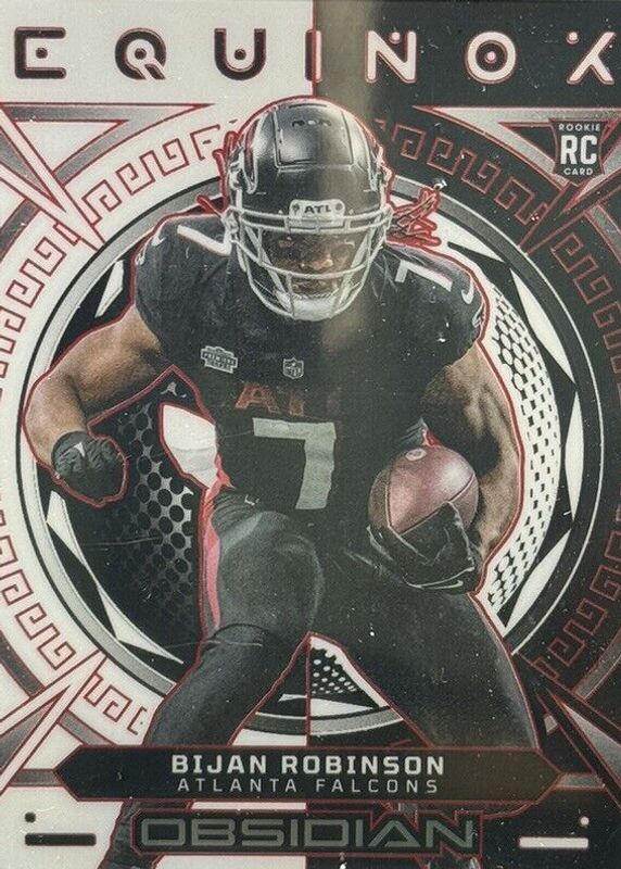 The Bijan Robinson 2023 Obsidian #1 Equinox - Electric Etch Red /10 Rookie card in Raw condition has not changed in price in the last 30 days and was last sold for $42.00 .