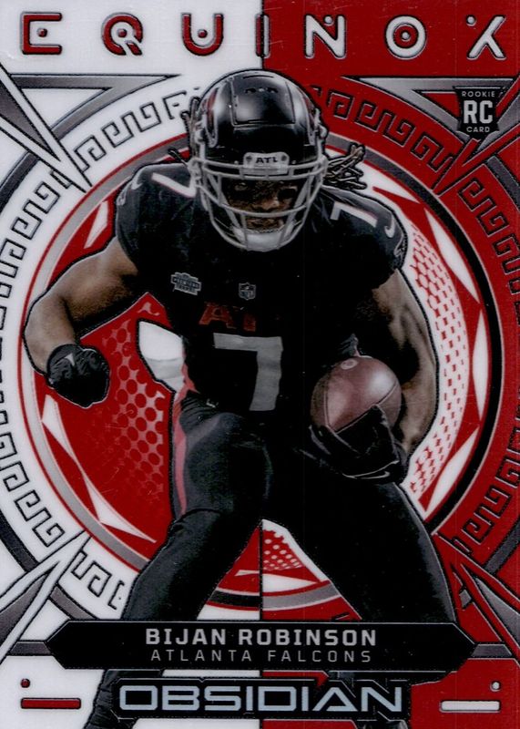 The Bijan Robinson 2023 Obsidian #1 Equinox - Electric Etch Red Flood Rookie card in Raw condition has not changed in price in the last 30 days and was last sold for $11.50 .