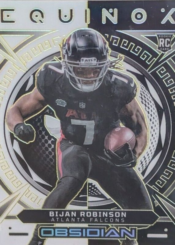 The Bijan Robinson 2023 Obsidian #1 Equinox - Electric Etch Yellow /25 Rookie card in Raw condition has not changed in price in the last 30 days and was last sold for $39.00 .