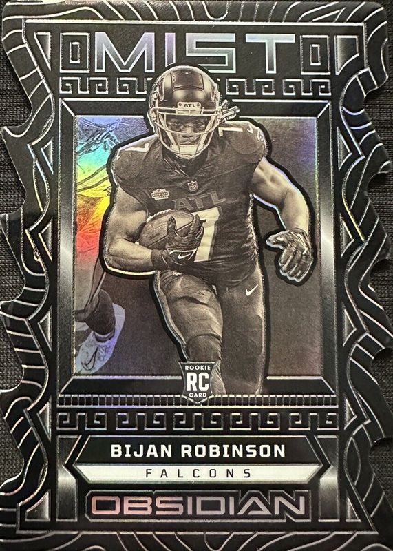 The Bijan Robinson 2023 Obsidian #2 Mist /(SSP) Rookie card in Raw condition has not changed in price in the last 30 days and was last sold for $44.00 .