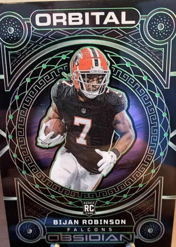 The Bijan Robinson 2023 Obsidian #1 Orbital - Electric Etch Green /35 Rookie card in Raw condition has not changed in price in the last 30 days and was last sold for $30.00 .