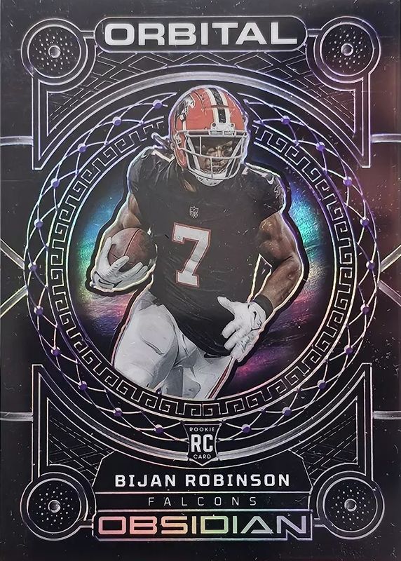 The Bijan Robinson 2023 Obsidian #1 Orbital - Electric Etch Purple /75 Rookie card in Raw condition has not changed in price in the last 30 days and was last sold for $19.99 .
