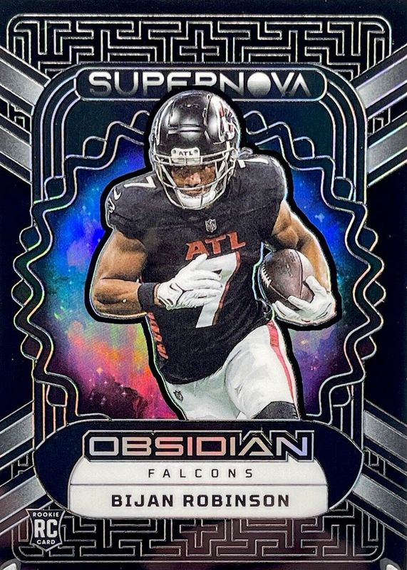 The Bijan Robinson 2023 Obsidian #11 Supernova /135 Rookie card in Raw condition has not changed in price in the last 30 days and was last sold for $5.00 .