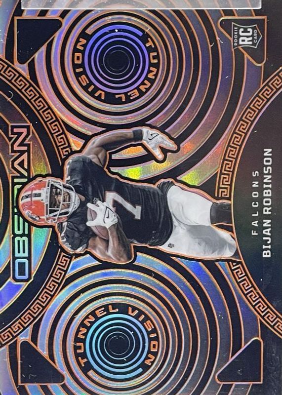 The Bijan Robinson 2023 Obsidian #6 Tunnel Vision - Electric Etch Orange /65 Rookie card in Raw condition has not changed in price in the last 30 days and was last sold for $18.00 .