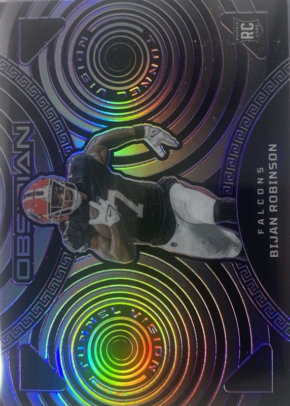 The Bijan Robinson 2023 Obsidian #6 Tunnel Vision - Electric Etch Purple /75 Rookie card in Raw condition has not changed in price in the last 30 days and was last sold for $12.00 .