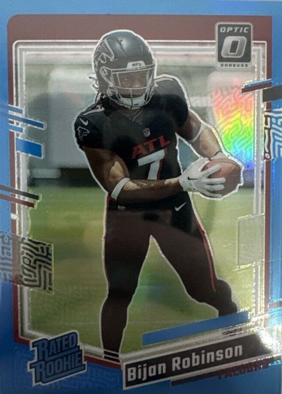 The Bijan Robinson 2023 Optic #206 Aqua /299 Rookie card in Raw condition has not changed in price in the last 30 days and was last sold for $26.00 .
