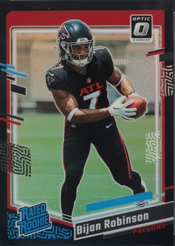 This card is 1 of 113 Bijan Robinson's card variations in the 2023 Optic set being tracked by Sports Card Investor, including Base, Blue Hyper, Blue Scope, Green Hyper, and Green Velocity.