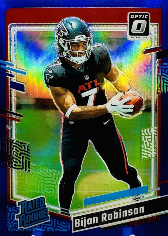 The Bijan Robinson 2023 Optic #206 Blue /199 Rookie card in Raw condition has not changed in price in the last 30 days and was last sold for $24.50 .