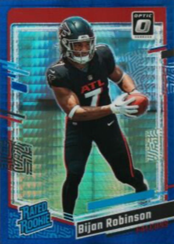The Bijan Robinson 2023 Optic #206 Blue Hyper Rookie card in Raw condition has moved up $2.70 (+54.0%) in the last 30 days and was last sold for $7.70 .