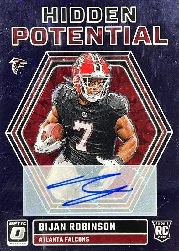 The Bijan Robinson 2023 Optic #HP-BR Hidden Potential Autographs - Purple Stars /25 Rookie card in Raw condition has not changed in price in the last 30 days and was last sold for $97.00 .