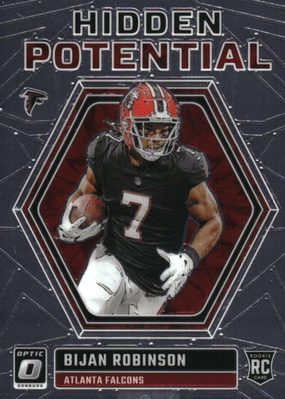 The Bijan Robinson 2023 Optic #HP-BR Hidden Potential Rookie card in Raw condition has moved down -$0.80 (-44.7%) in the last 30 days and was last sold for $0.99 .