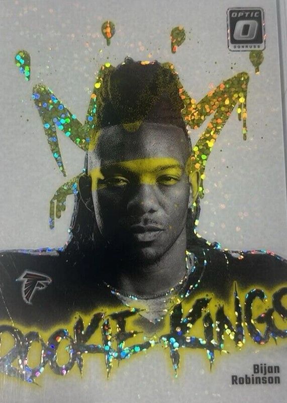 The Bijan Robinson 2023 Optic #13 Rookie Kings - White Sparkle /1 card in Raw condition has not changed in price in the last 30 days and was last sold for $556.00 .