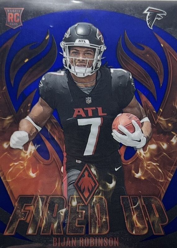 The Bijan Robinson 2023 Phoenix #FU-8 Fired Up - Blue /25 Rookie card in Raw condition has not changed in price in the last 30 days and was last sold for $15.00 .