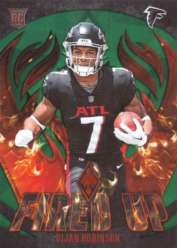 The Bijan Robinson 2023 Phoenix #FU-8 Fired Up - Green /15 Rookie card in Raw condition has not changed in price in the last 30 days and was last sold for $26.00 .